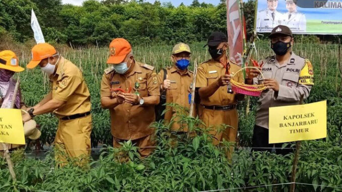 Bersama Walikota Banjarbaru, DKP3, Camat Cempaka, Lurah Cempaka, Bhabinkamtibmas bersama Kelompok Tani panen holtikultura (Lombok jenis Columbos) berlokasi di Sungai Abit RT. 027 RW. 009 Kelurahan Cempaka.