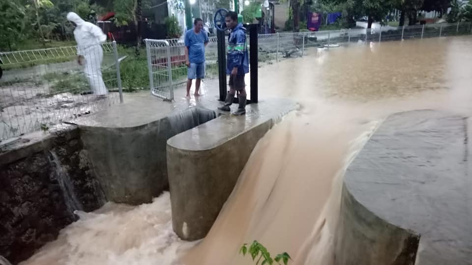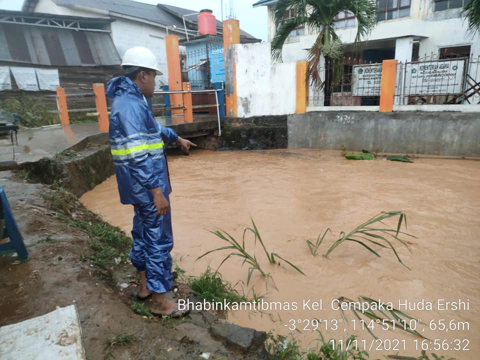 Terjadi hujan deras di Kelurahan Cempaka pukul 15.30 WITA yang menyebabkan debit air di embung naik.